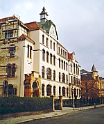 Am Eingang zum Schulgelände steht die heute als Schulhort der benachbarten 35. Grundschule genutzte frühere